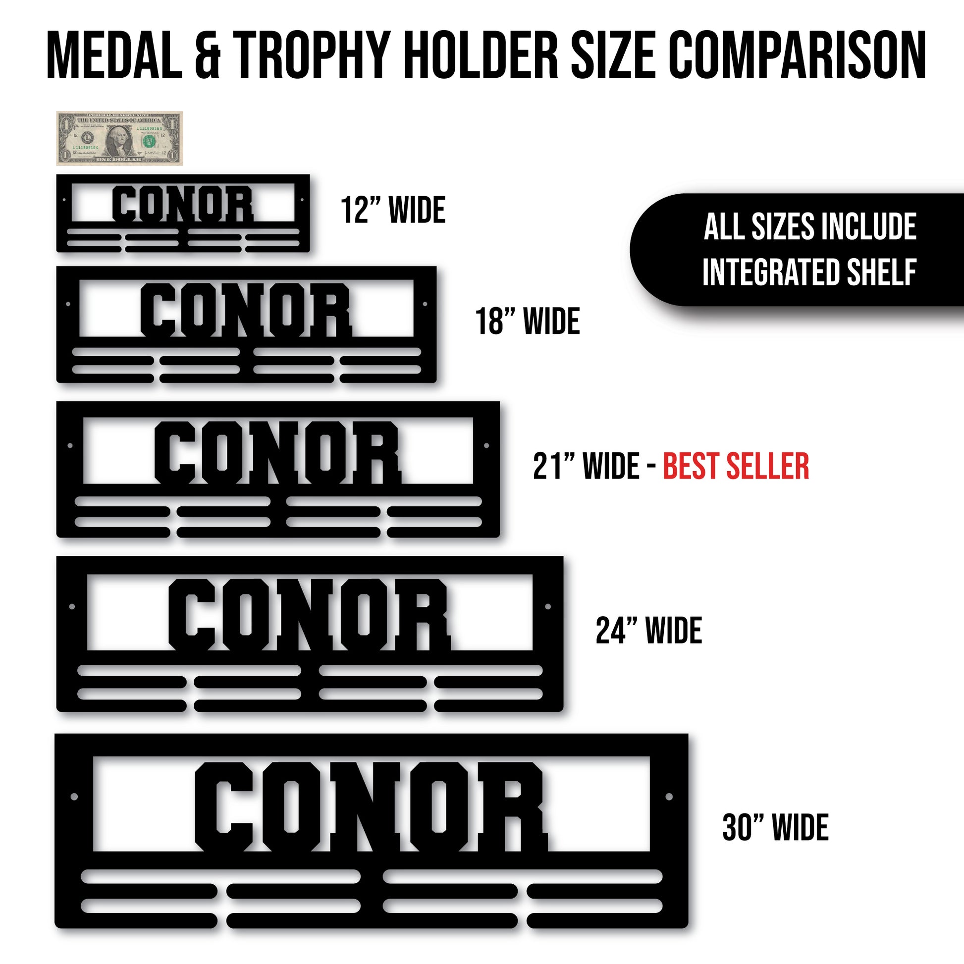 With an INTEGRATED SHELF, you can now display both trophies and medals with one statement piece!