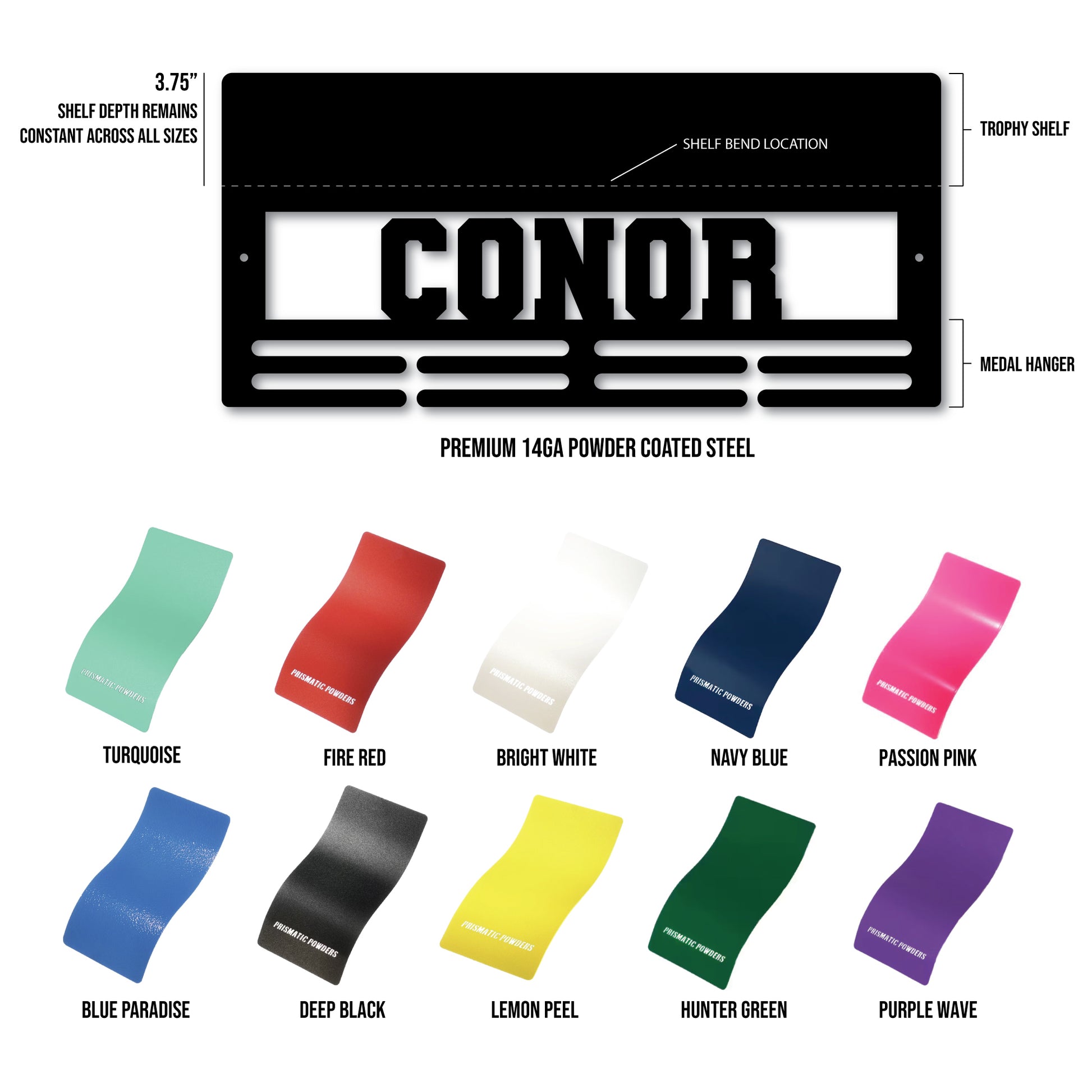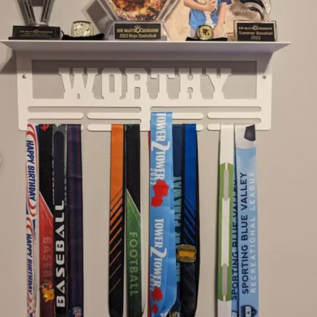 Celebrate your achievements with our custom medal hanger and trophy shelf display! Fabricated with thick, 14 gauge steel, our medal and trophy holders are powder coated for a professional finished look.