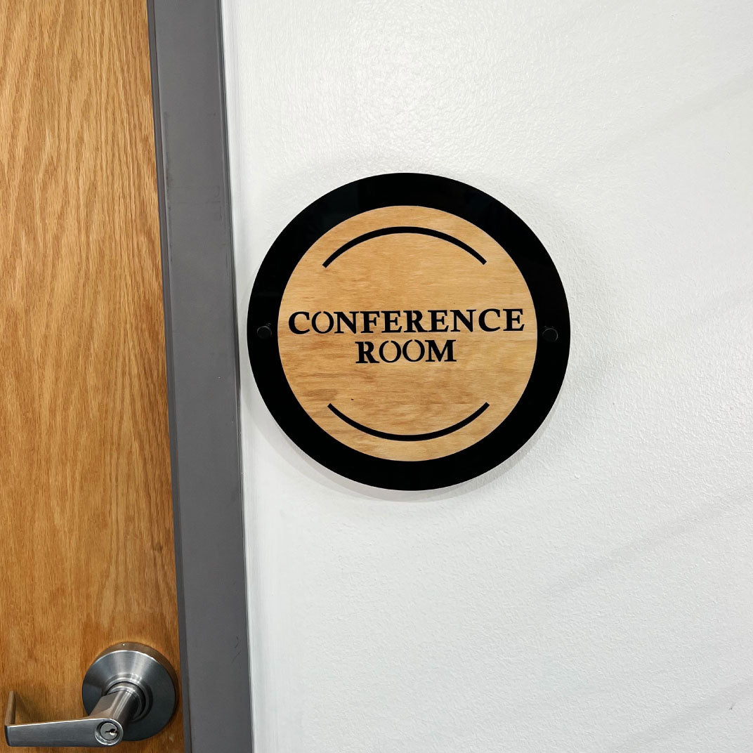 All business signage comes with the hardware needed (metal standoffs) to mount nicely to your wall. Our signage consists of 1/8" birch plywood cutouts over 1/4" black acrylic.