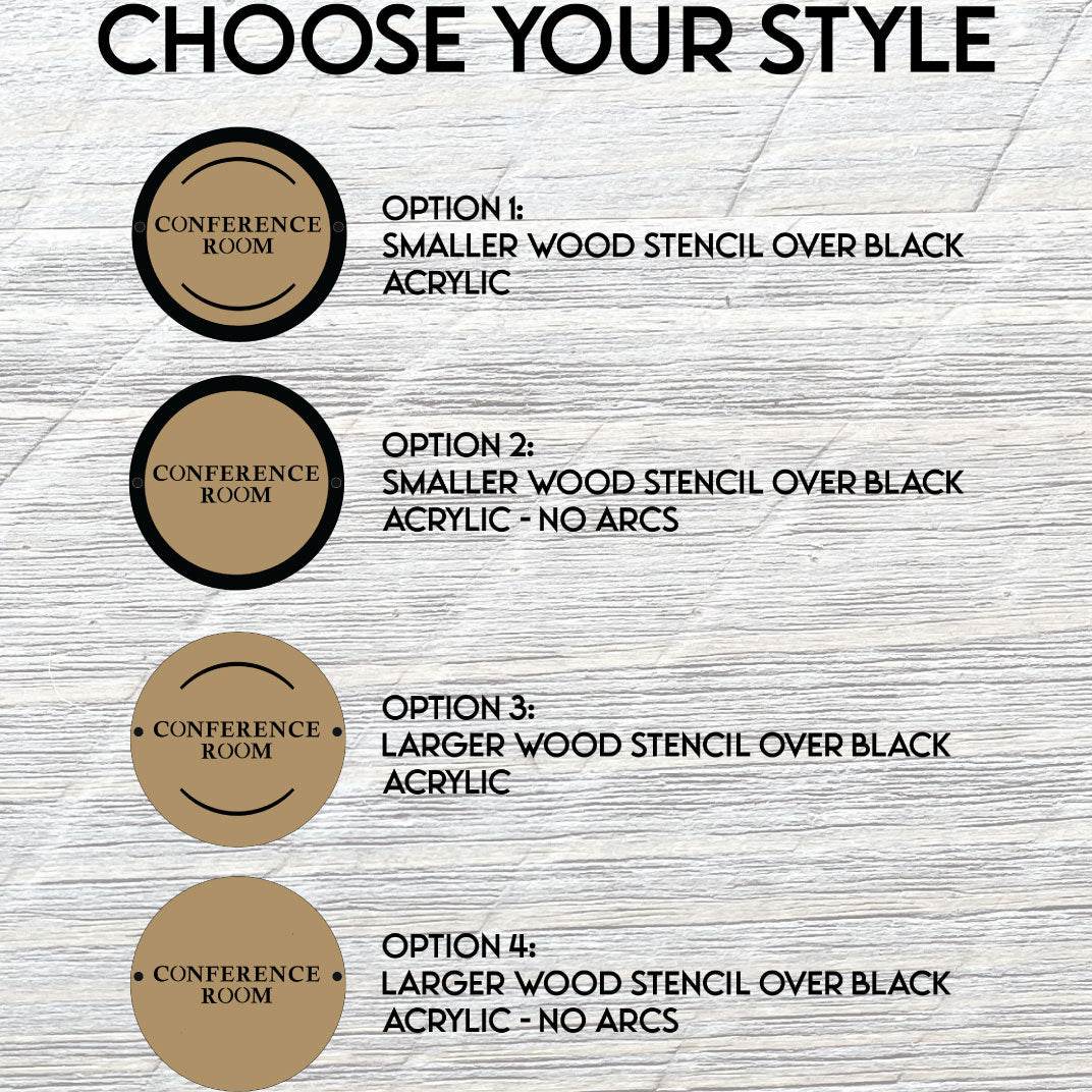 Our standard floating office signs come in sizes between 6 inches and 12 inches. For options 1 and 2, the acrylic is two inches wider than the birch wood that sits on top of it.